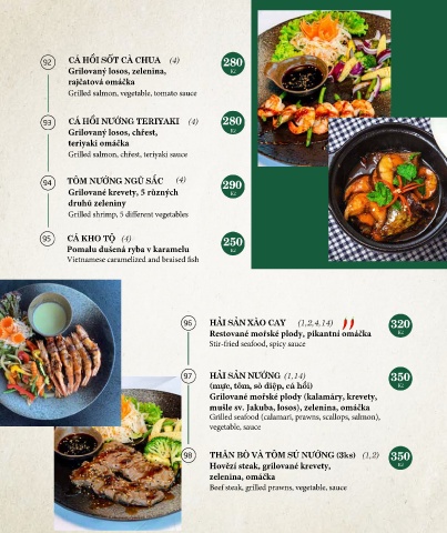 mušle sv. Jakuba, losos), zelenina, omáčka